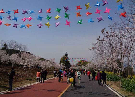 国传统的风车,悬挂在公园中,更让我们能感受樱花与风车交