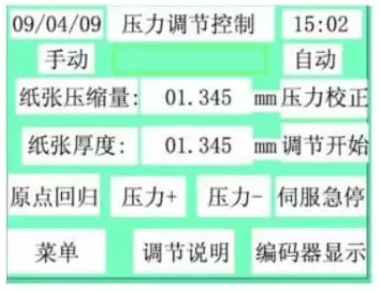 建立初始画面,在画面上分别设置按钮开关,在开关上分别写上,压力+、压力-、原点回归、自动调节、压力校正、伺服急停等字样,其中继电器的对应情况如上所写。控制画面如图3和图4。